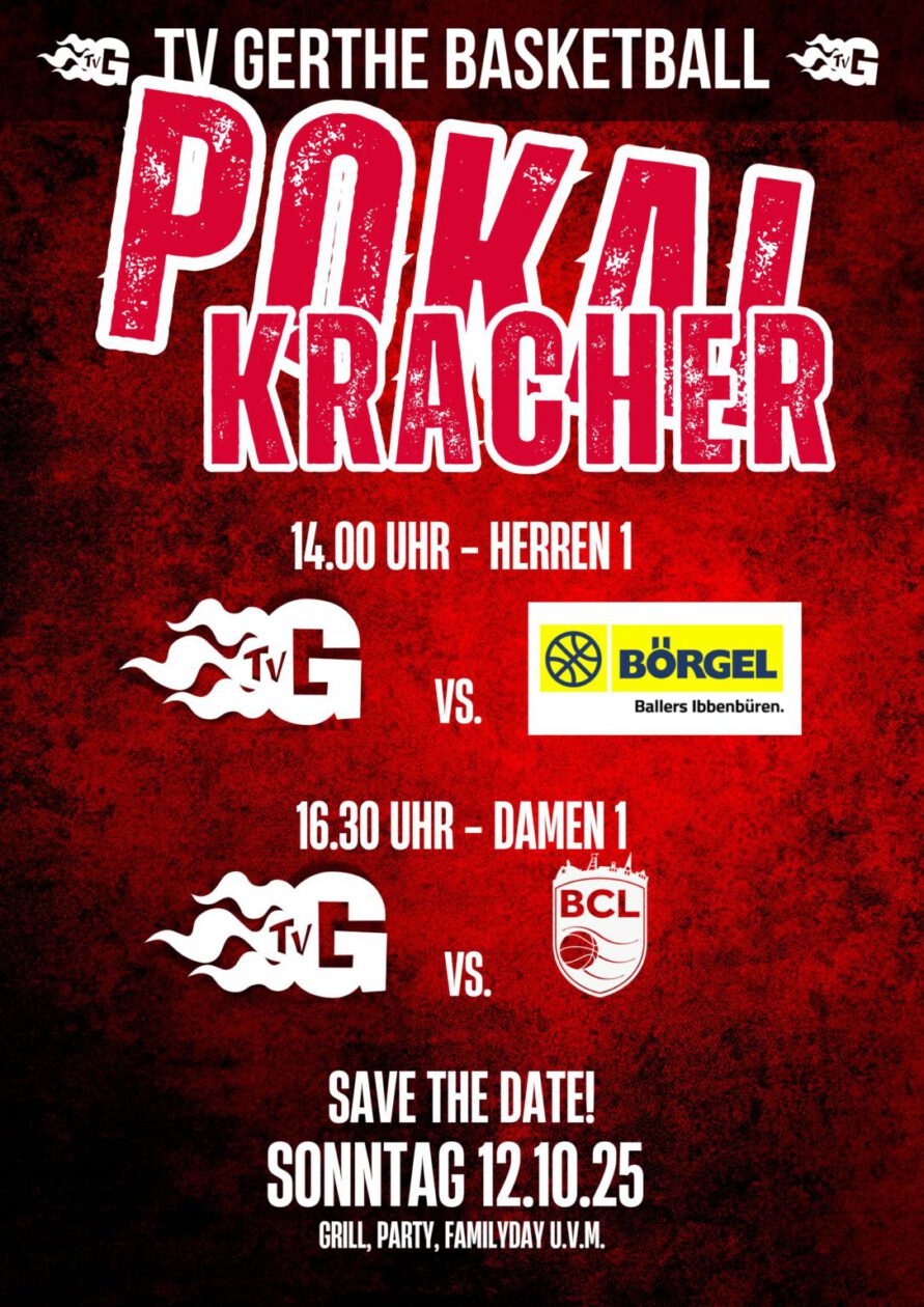 Am Samstag, 12. Oktober, empfängt der TV Gerthe im Gerther Dome den 1. Regionalligisten TV Brögel Ballers Ibbenbüren zum Pokal-Kracher um 14.00 Uhr, bevor dann um 16.30 Uhr unsere Damen im Pokalderby gegen Regionalligisten BC Langendreer ran müssen. Zwei besonders spannende Spiele werden uns erwarten.