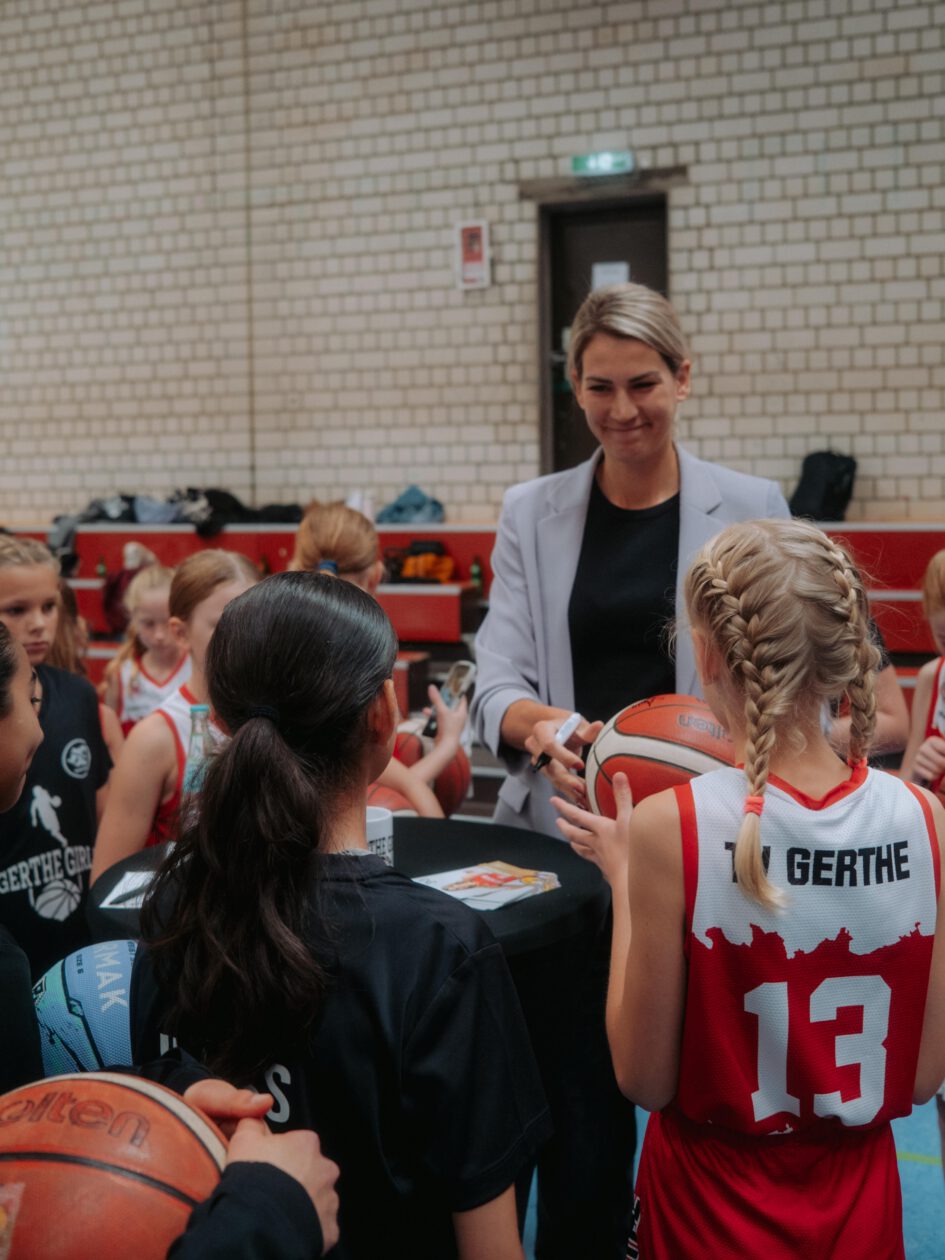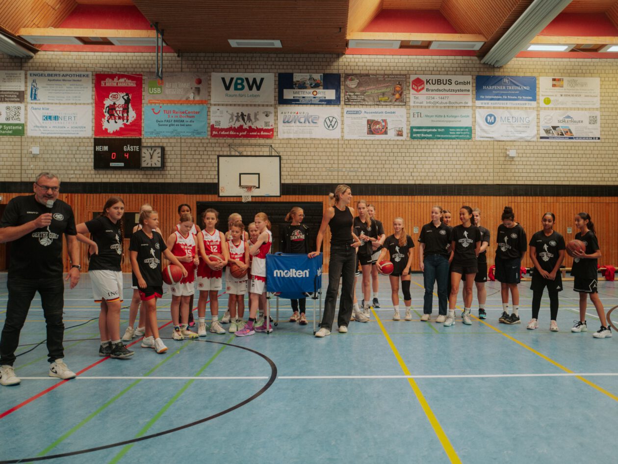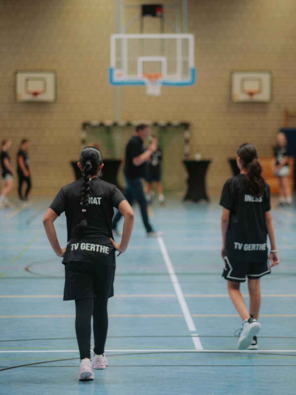 Im Anschluss präsentierten die Gerthe Girls praktische Basketballübungen und luden die Gäste zu aktiven Mitmachaktionen auf das Feld ein – mit viel Spaß, Energie und Bewegung wurde gedribbelt, gepasst und auf die Körbe geworfen.