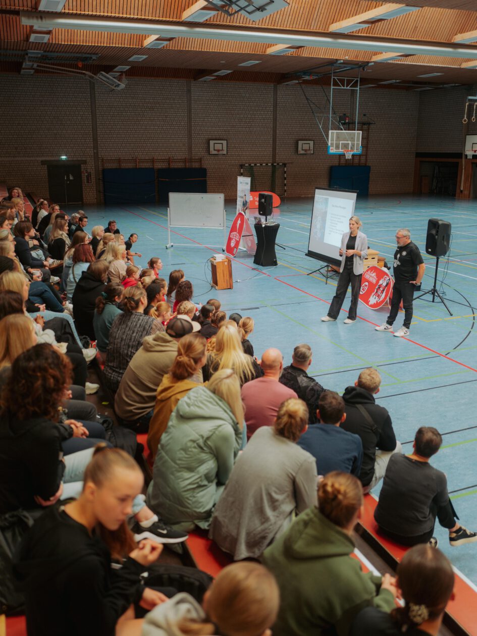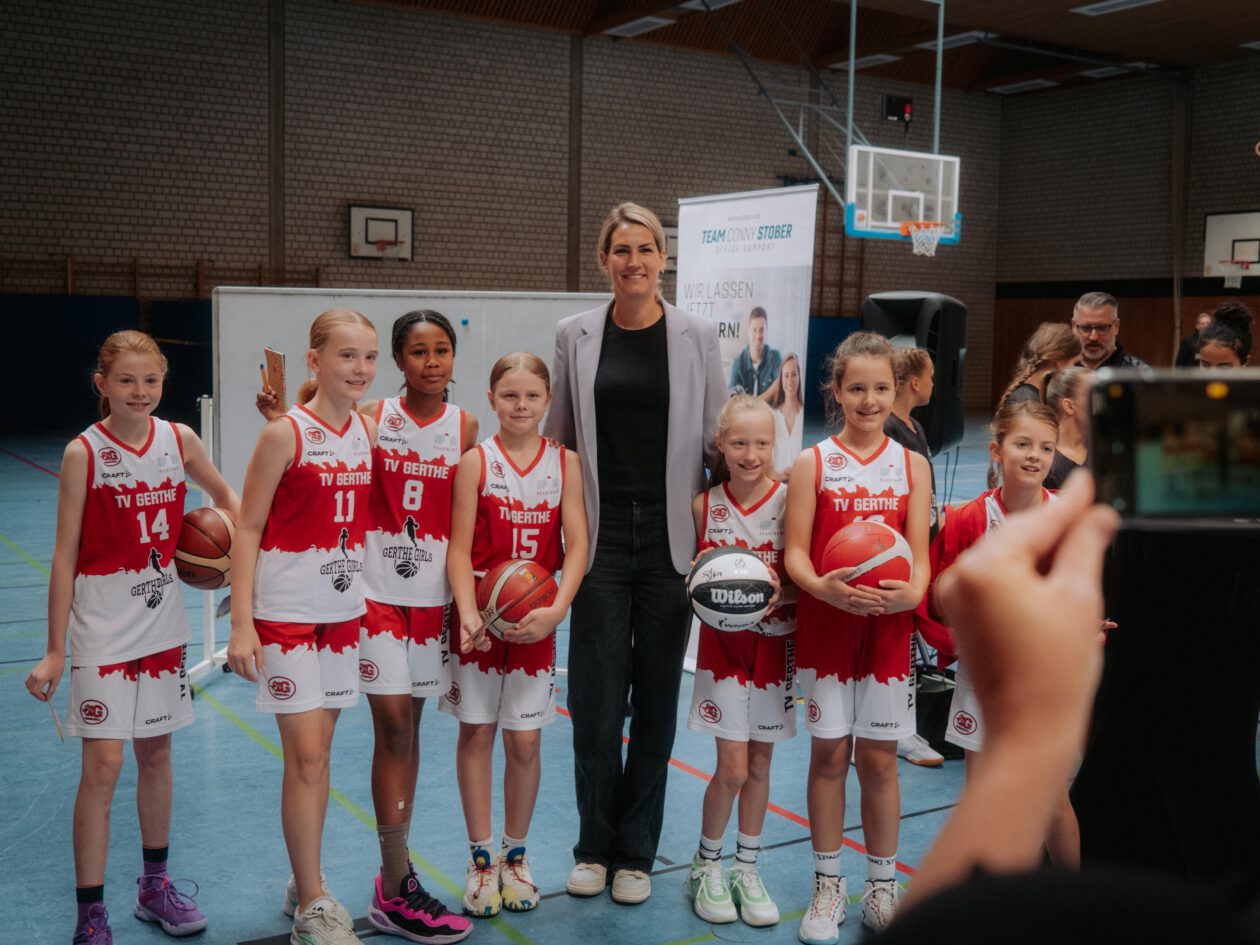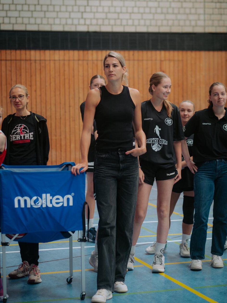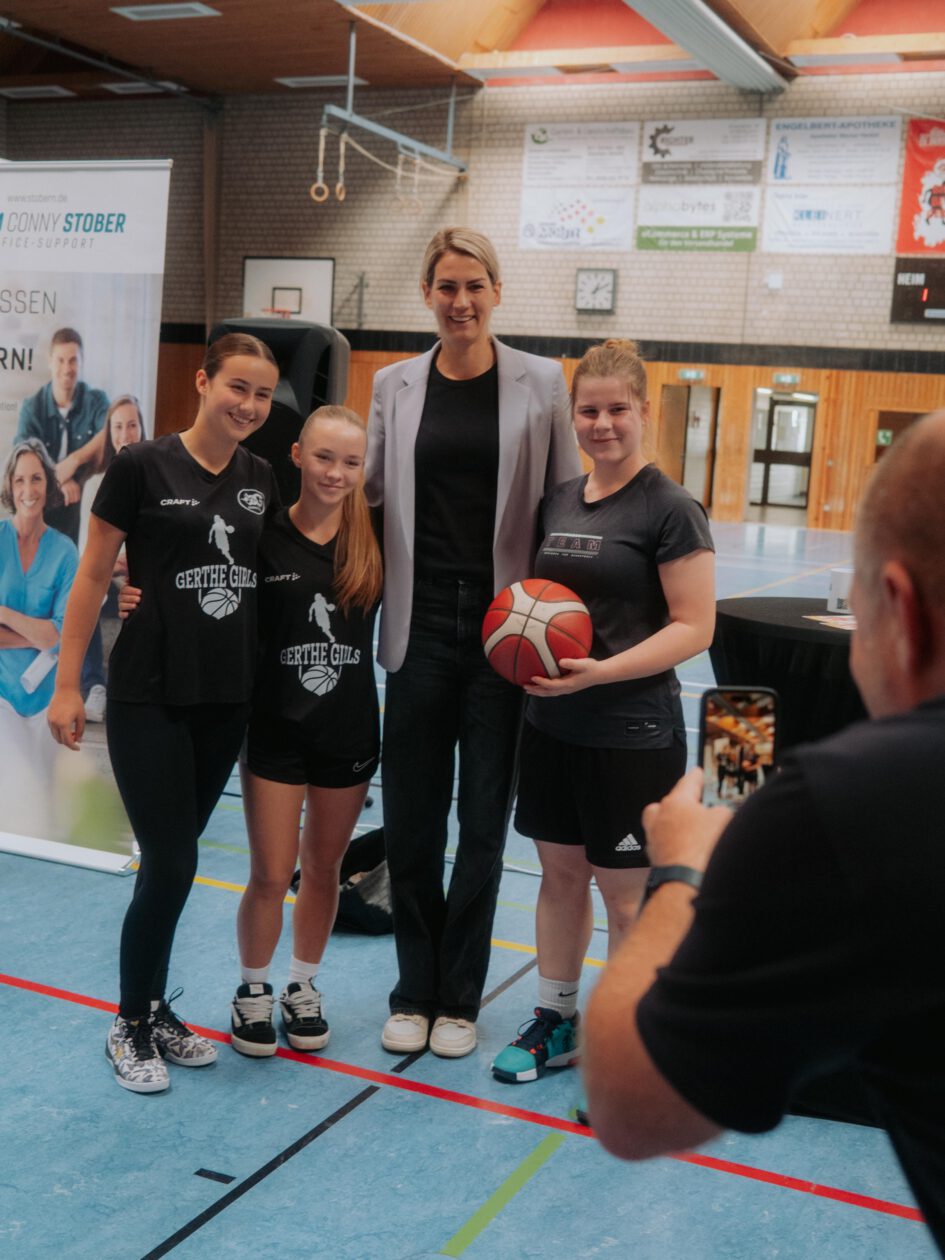Im Anschluss präsentierten die Gerthe Girls praktische Basketballübungen und luden die Gäste zu aktiven Mitmachaktionen auf das Feld ein – mit viel Spaß, Energie und Bewegung wurde gedribbelt, gepasst und auf die Körbe geworfen.