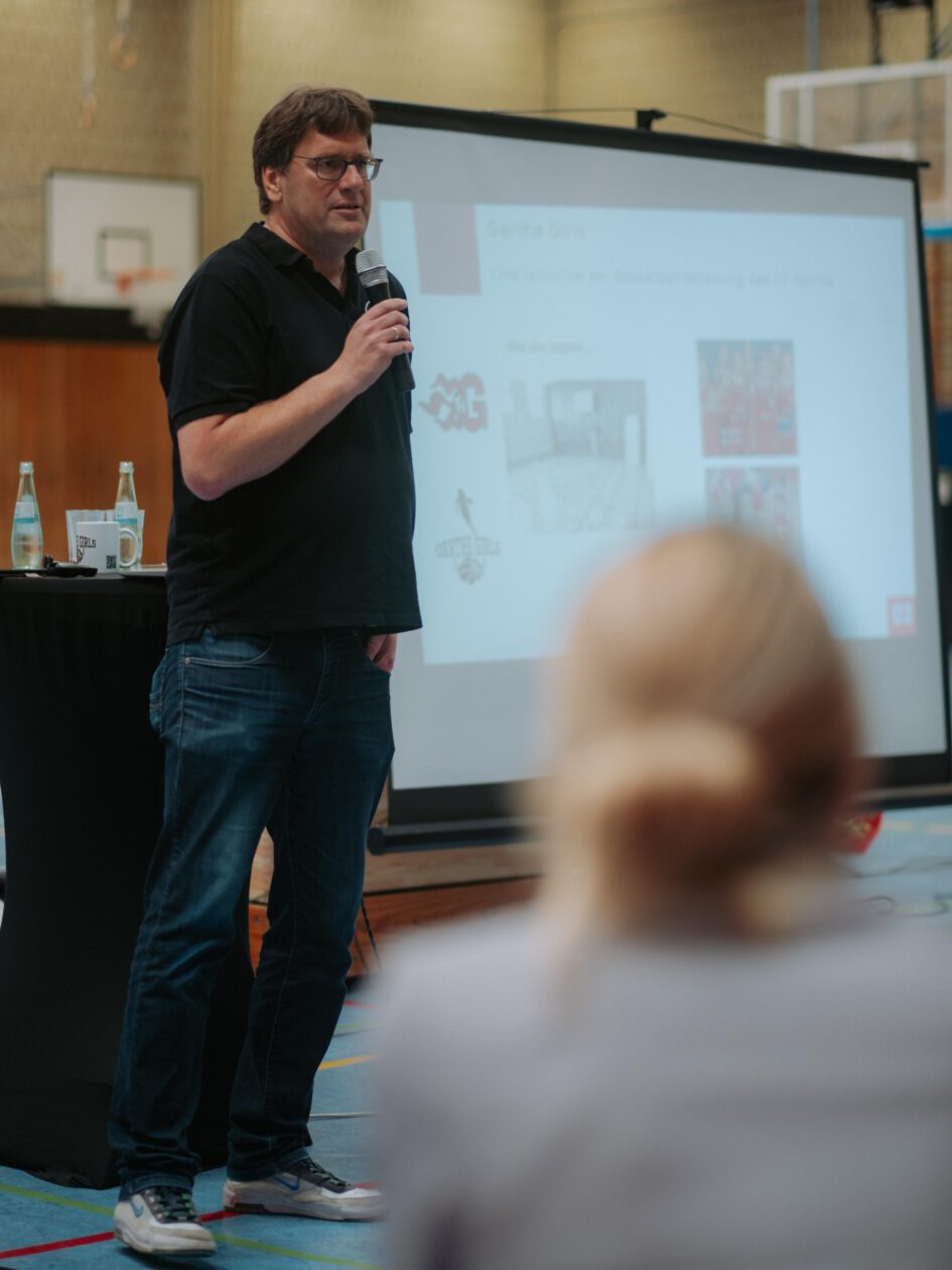 Nach einer Begrüßung durch Dirk Pütz, Mitbegründer der Gerthe-Girls-Initiative, eröffnete Dr. Wanda Gerding – Gleichstellungsbeauftragte der RUB, Wissenschaftlerin und Mutter eines Gerthe Girls – das Event mit einem eindrucksvollen Vortrag aus unterschiedlichen Perspektiven zu Beweggründen, Zielen und gelebten Formaten dieser Initiative.