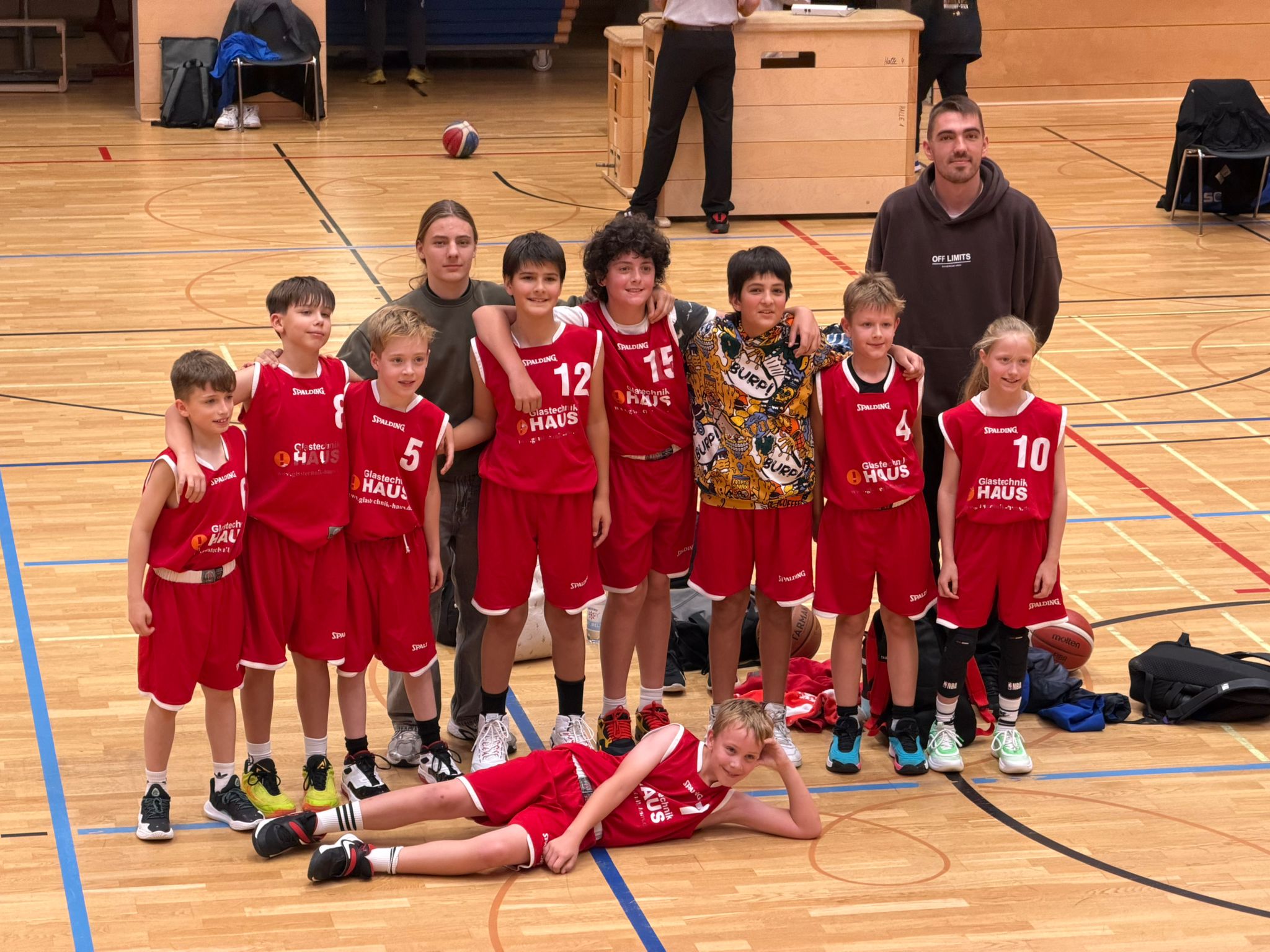 Die Trainer setzten in der Starting Four auf Thore, Linus, Julian und Jonah, die den Gegner früh unter Druck setzen sollten. Dieses Konzept ging perfekt auf: Mit aggressiver Verteidigung und hohem Tempo erspielte sich das Team gleich zu Beginn ein deutliches 17:8 im ersten Achtel. Im zweiten Abschnitt schlichen sich zwar einige Nachlässigkeiten in der Defensive ein, sodass Ronsdorf kam zu oft zu einfachen Korblegern und gewann das Achtel knapp mit 15:13. Doch Gerthe fing sich schnell wieder. Im dritten und vierten Achtel zeigte das Team wieder die gewohnte Energie und zog bis zur Halbzeit auf 58:39 davon. Auch in der zweiten Hälfte blieb das Tempo hoch. Immer wieder lief der Ball schnell durch die eigenen Reihen, und alle Spielerinnen und Spieler beteiligten sich am Scoring. Am Ende stand ein verdienter 107:71-Erfolg, der für viel Erleichterung im Trainerteam sorgte. Herausragender Spieler war Jonah Sachs, der mit starkem Stellungsspiel und viel Übersicht 21 Punkte erzielte. Doch auch die Teamleistung überzeugte: Mit Moritz, Jonah, Julian, Linus, Thore und Fatih punkteten gleich 6 Spieler zweistellig.
