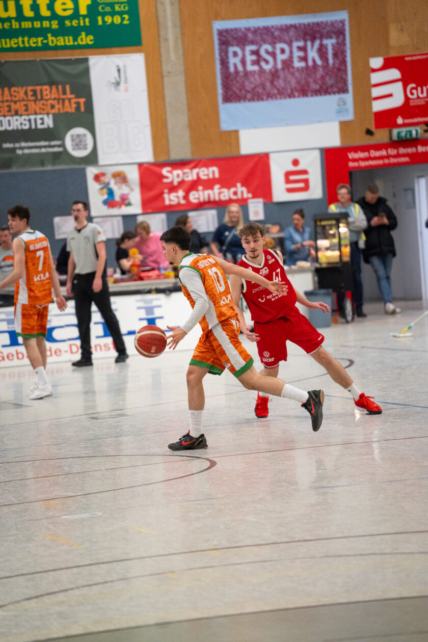 Nach der Pause präsentierte sich Dorsten deutlich aggressiver und kam mit viel Energie aus der Kabine. Die Gastgeber trafen nun sicherer aus dem Feld und arbeiteten sich Punkt für Punkt heran, bis sie beim 49:50 wieder in Schlagdistanz waren. Die Gerther hielten dagegen, stabilisierten ihr Spiel zum Ende des dritten Viertels wieder etwas und gingen mit einer 62:56-Führung in den Schlussabschnitt.