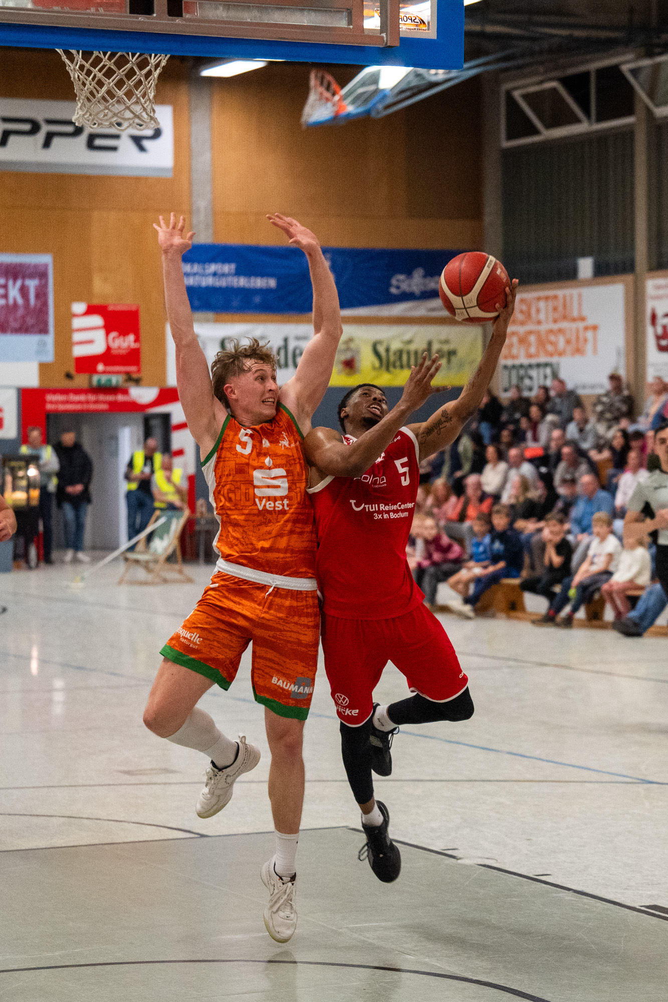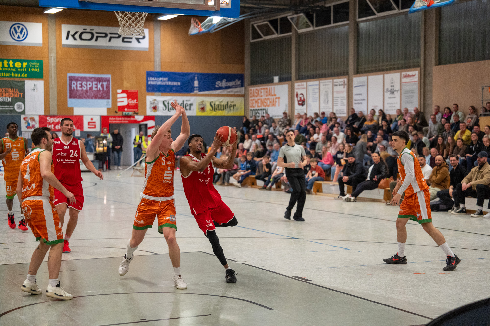 Auch im letzten Viertel entwickelte sich eine umkämpfte Partie. Dorsten, getragen von der Unterstützung der heimischen Zuschauer, agierte aggressiv zum Korb und stark beim Rebound, während der TV Gerthe zunächst ruhig blieb und seine Führung verteidigte. Fünf Minuten vor dem Ende lag Gerthe weiterhin mit 70:64 vorne.