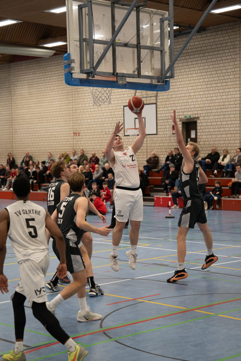 Nach dem klaren Auswärtserfolg in Soest wollten die Gerther im heimischen Profina-Dome unbedingt nachlegen, den Platz an der Tabellenspitze verteidigen und gegen die Reserve aus Essen den nächsten Sieg einfahren. Die Voraussetzungen waren allerdings alles andere als optimal: Unter der Woche war aufgrund zahlreicher Erkältungen und Grippefälle kaum ein geregeltes Training möglich. Davon ließen sich die Gastgeber zu Beginn aber nicht beeindrucken, starteten hochkonzentriert und setzten direkt ein Ausrufezeichen. Mit einem 11:2-Lauf legte der TVG stark los und hatte das Spiel zunächst im Griff. Doch schon im ersten Viertel schlichen sich viele einfache Ballverluste, Unkonzentriertheiten und leichte Fehlwürfe ein. Trotzdem blieb die Führung stabil, nach zehn Minuten stand es 21:11 für Gerthe.