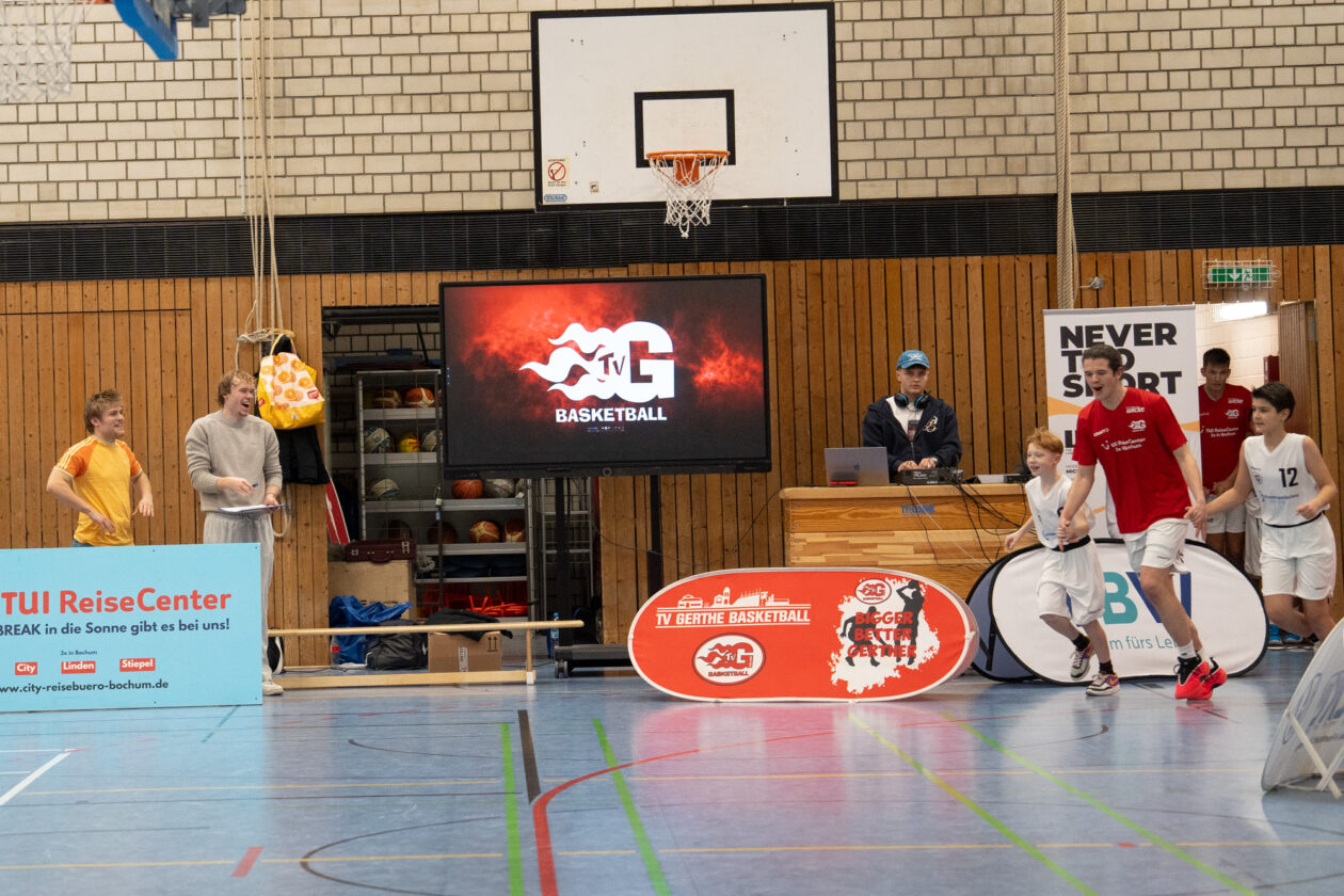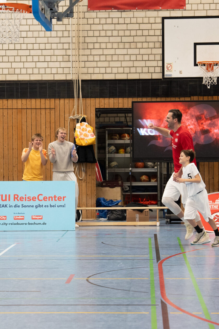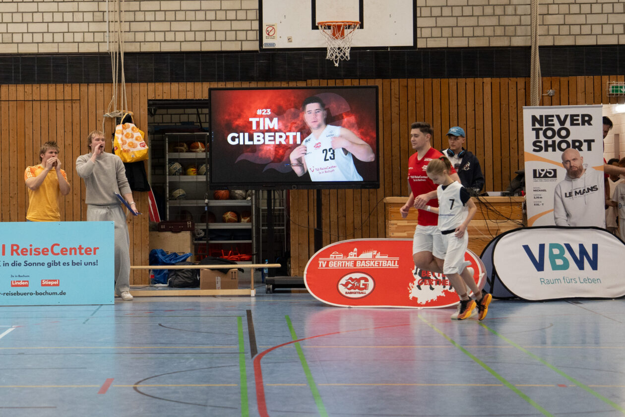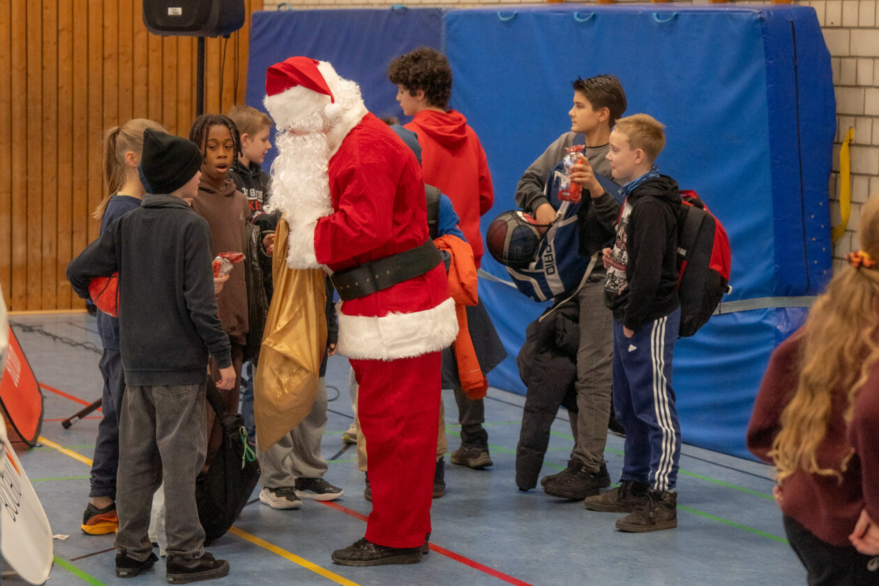 Der Samstagabend im Profina Dome war ein echtes Highlight – sportlich wie auch atmosphärisch. Die Halle war fest in Gerther Hand, rund 250 Zuschauer sorgten für lautstarke Unterstützung, und der Nikolaus selbst schaute vorbei und machte den Abend für die Kinder unvergesslich. Rund 60 Kids durften vom Nikolaus überbrachte Schokolade genießen, dazu stellte die Sportjugend des Stadtsportbundes Bochum die aufblasbare Basketballanlage „4 Gewinnt“, die von den Kindern begeistert genutzt wurde.