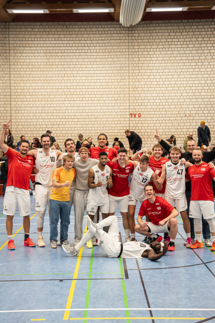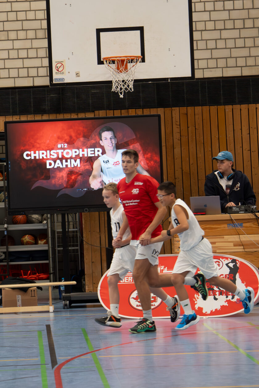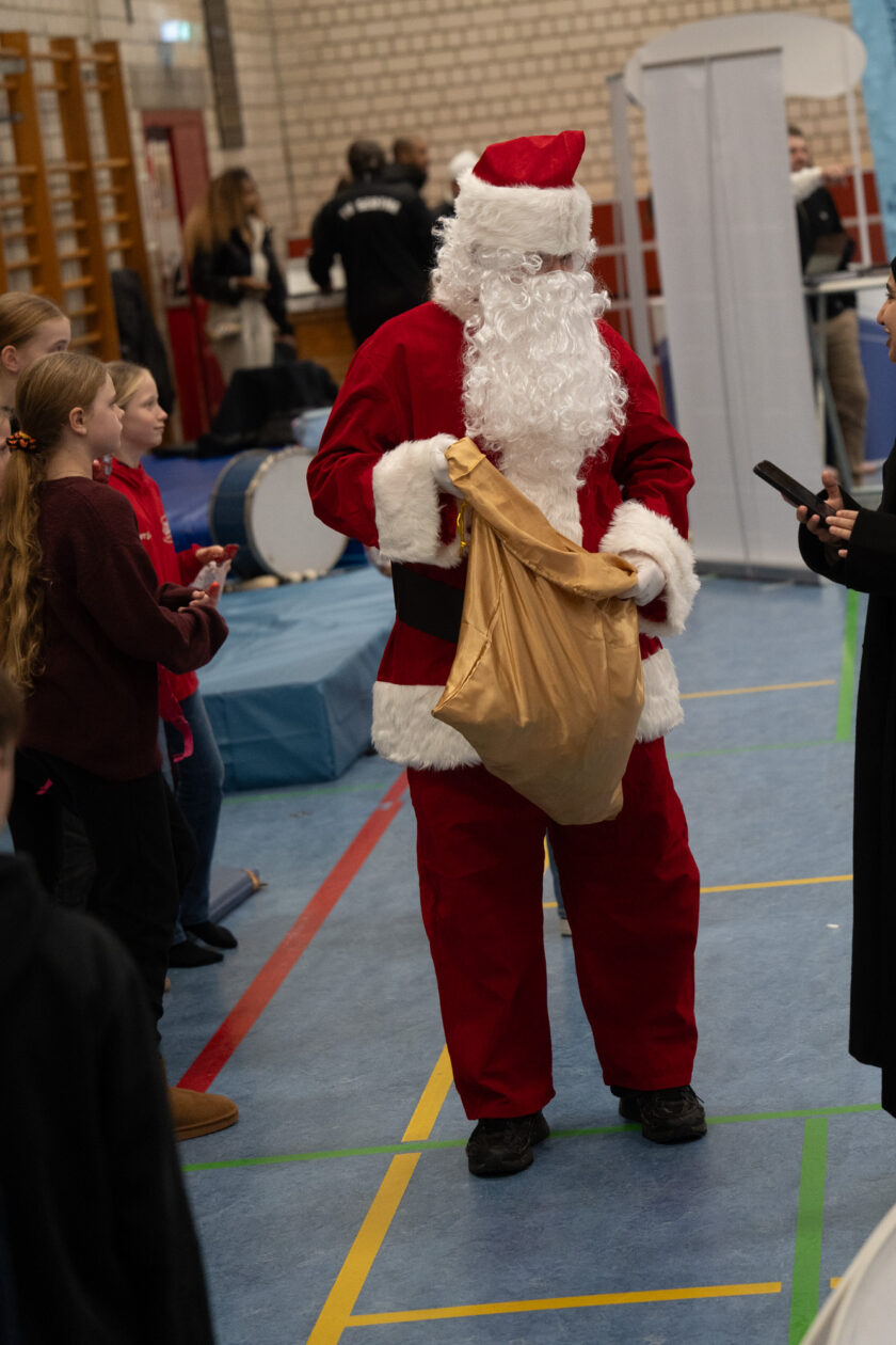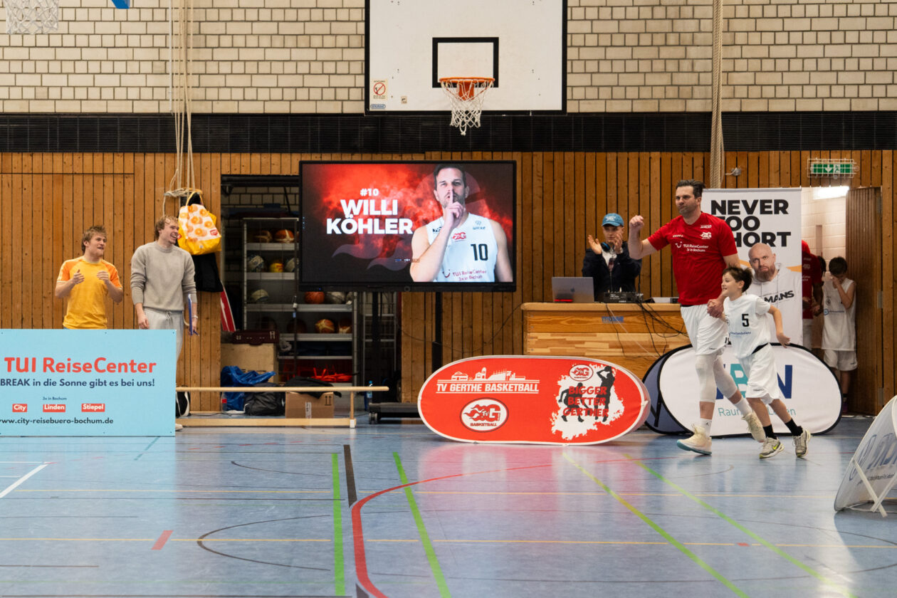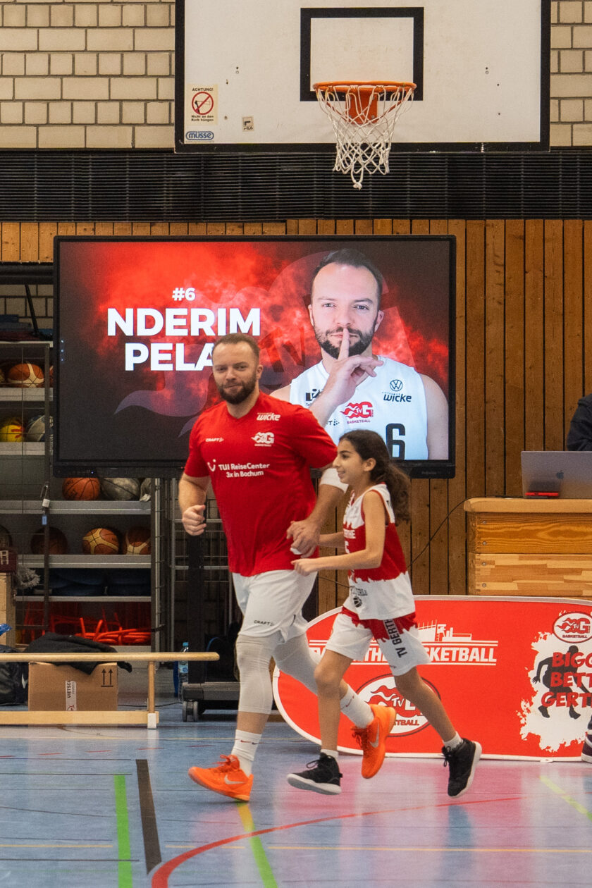 Der Samstagabend im Profina Dome war ein echtes Highlight – sportlich wie auch atmosphärisch. Die Halle war fest in Gerther Hand, rund 250 Zuschauer sorgten für lautstarke Unterstützung, und der Nikolaus selbst schaute vorbei und machte den Abend für die Kinder unvergesslich. Rund 60 Kids durften vom Nikolaus überbrachte Schokolade genießen, dazu stellte die Sportjugend des Stadtsportbundes Bochum die aufblasbare Basketballanlage „4 Gewinnt“, die von den Kindern begeistert genutzt wurde.