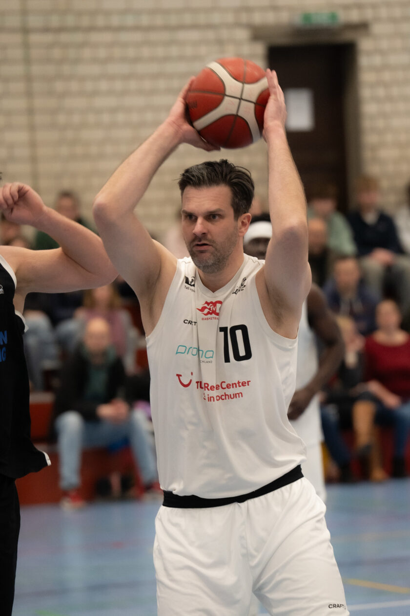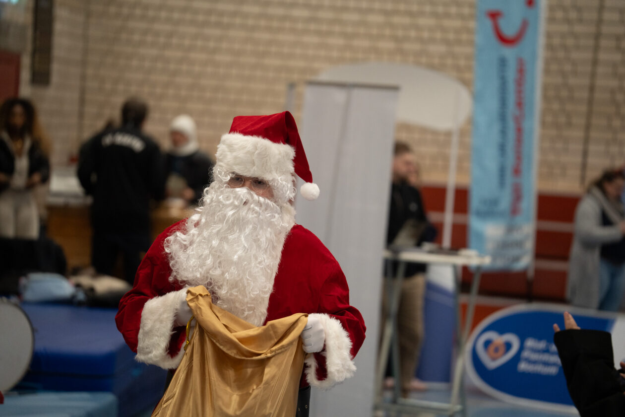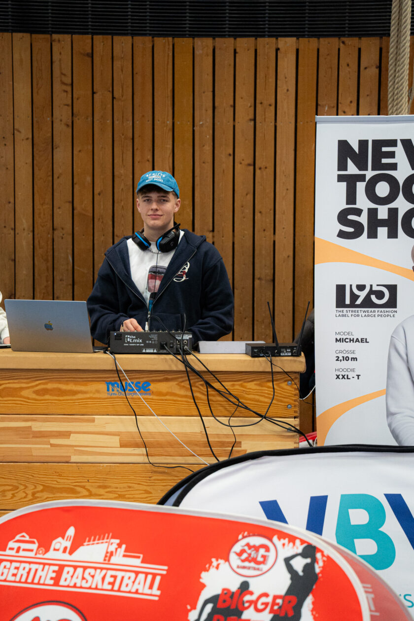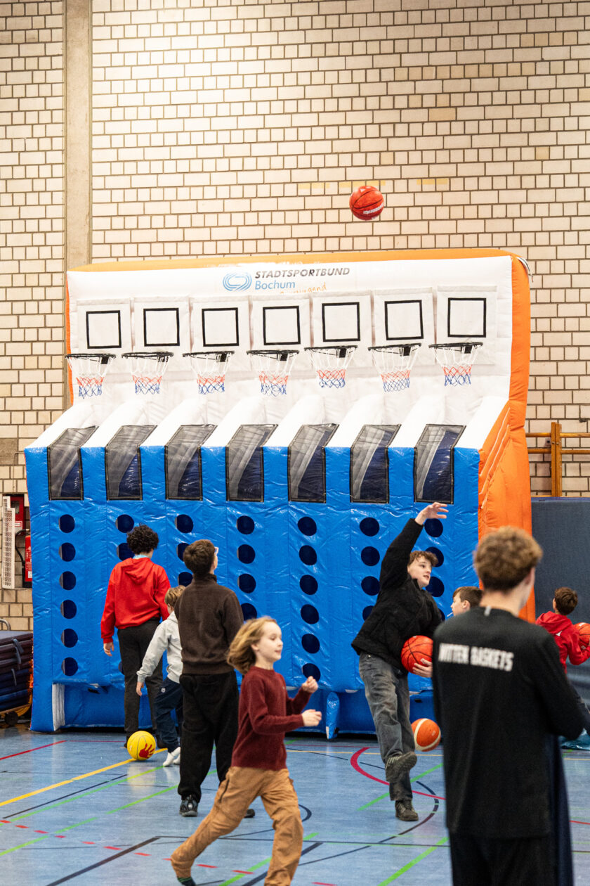 Der Samstagabend im Profina Dome war ein echtes Highlight – sportlich wie auch atmosphärisch. Die Halle war fest in Gerther Hand, rund 250 Zuschauer sorgten für lautstarke Unterstützung, und der Nikolaus selbst schaute vorbei und machte den Abend für die Kinder unvergesslich. Rund 60 Kids durften vom Nikolaus überbrachte Schokolade genießen, dazu stellte die Sportjugend des Stadtsportbundes Bochum die aufblasbare Basketballanlage „4 Gewinnt“, die von den Kindern begeistert genutzt wurde.
