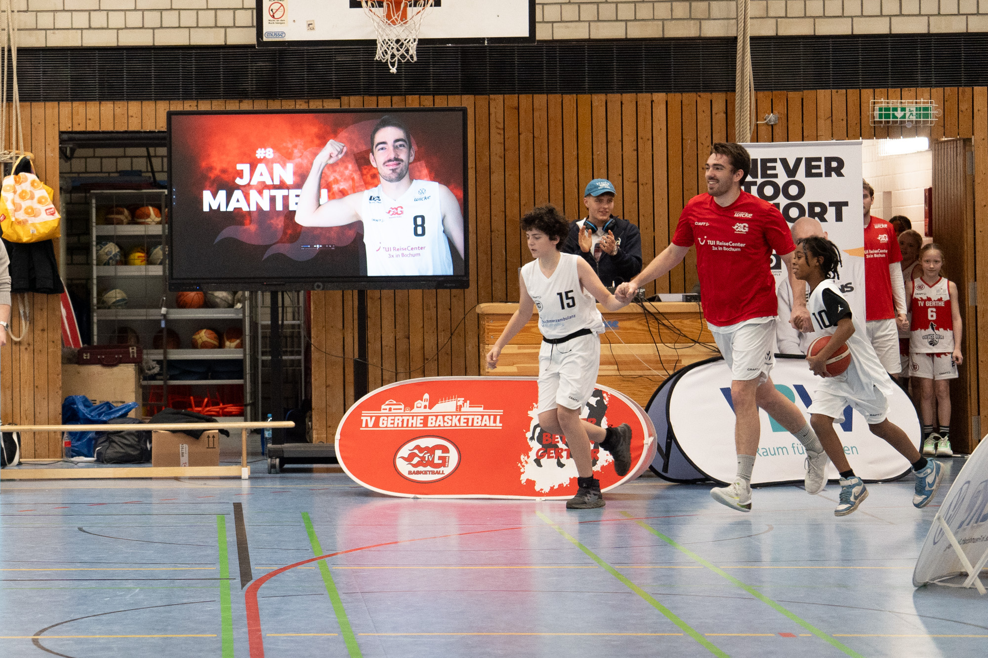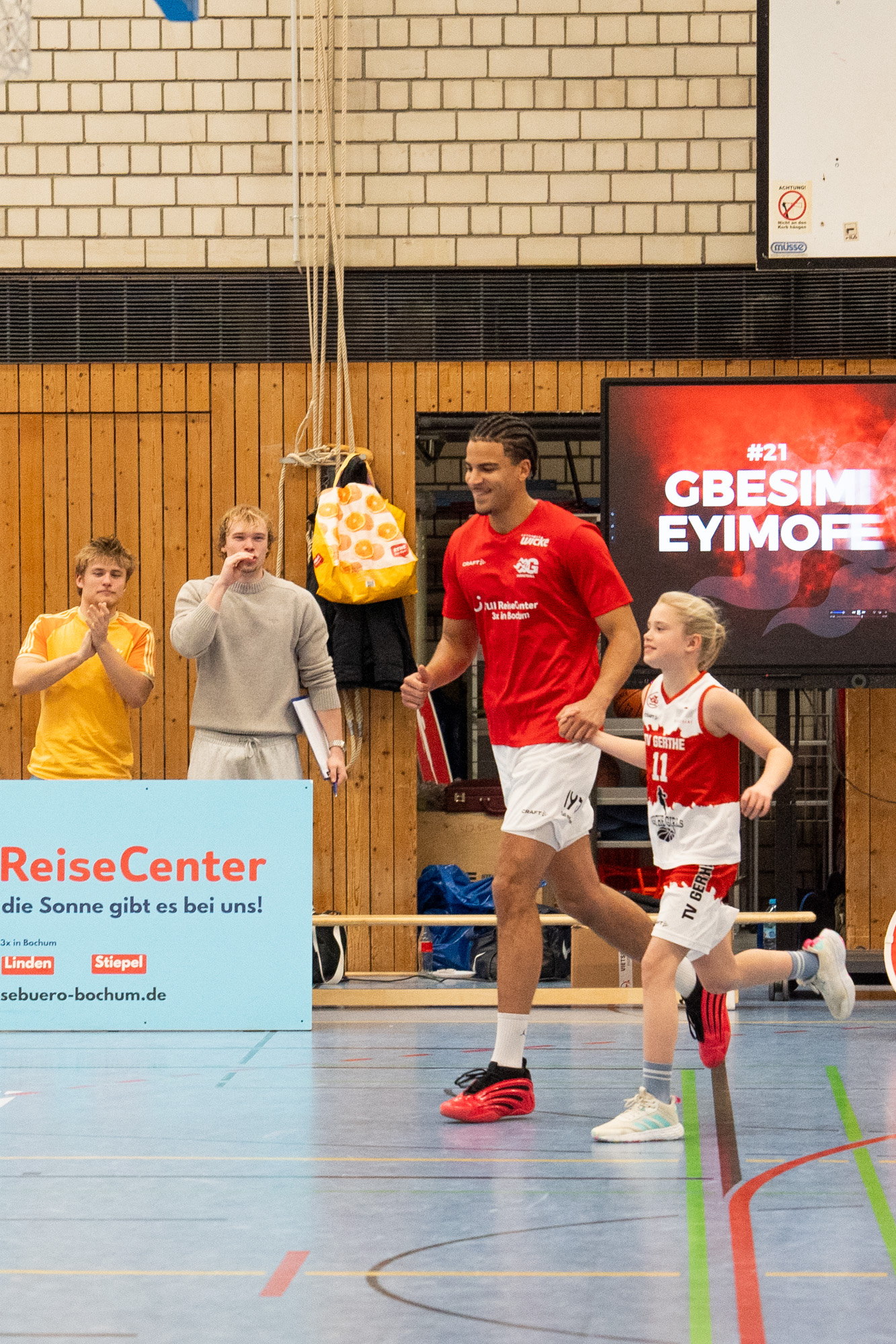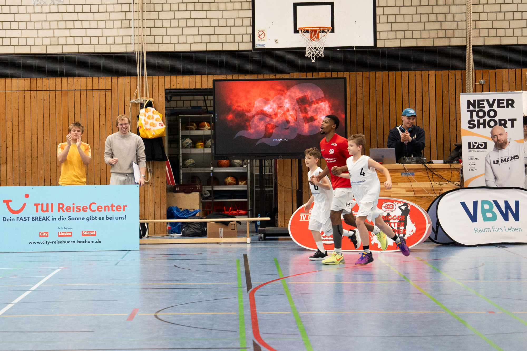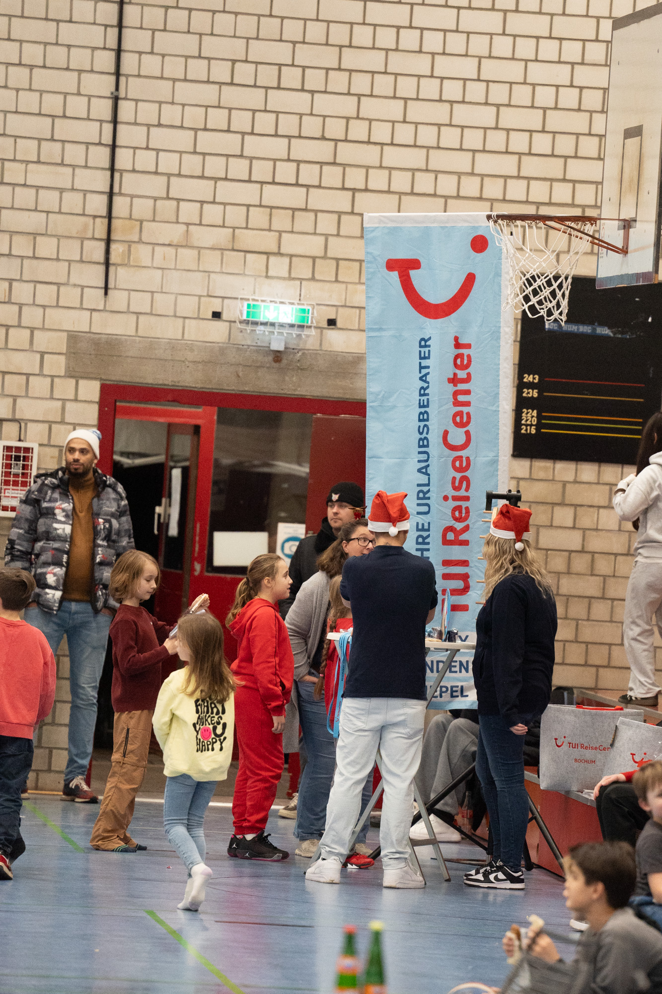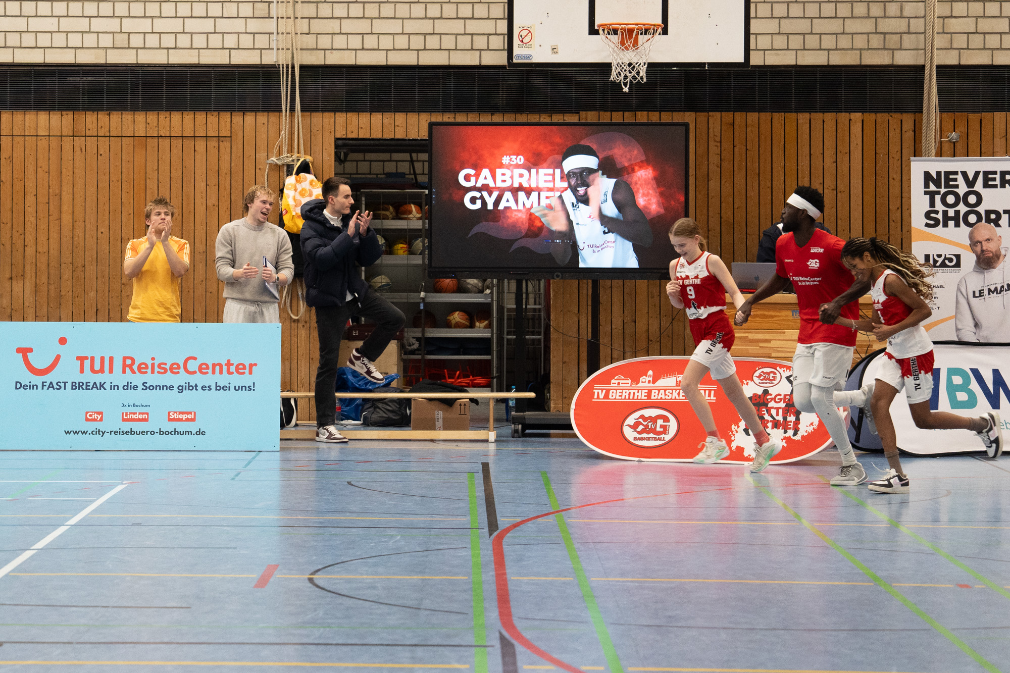 Der Samstagabend im Profina Dome war ein echtes Highlight – sportlich wie auch atmosphärisch. Die Halle war fest in Gerther Hand, rund 250 Zuschauer sorgten für lautstarke Unterstützung, und der Nikolaus selbst schaute vorbei und machte den Abend für die Kinder unvergesslich. Rund 60 Kids durften vom Nikolaus überbrachte Schokolade genießen, dazu stellte die Sportjugend des Stadtsportbundes Bochum die aufblasbare Basketballanlage „4 Gewinnt“, die von den Kindern begeistert genutzt wurde.