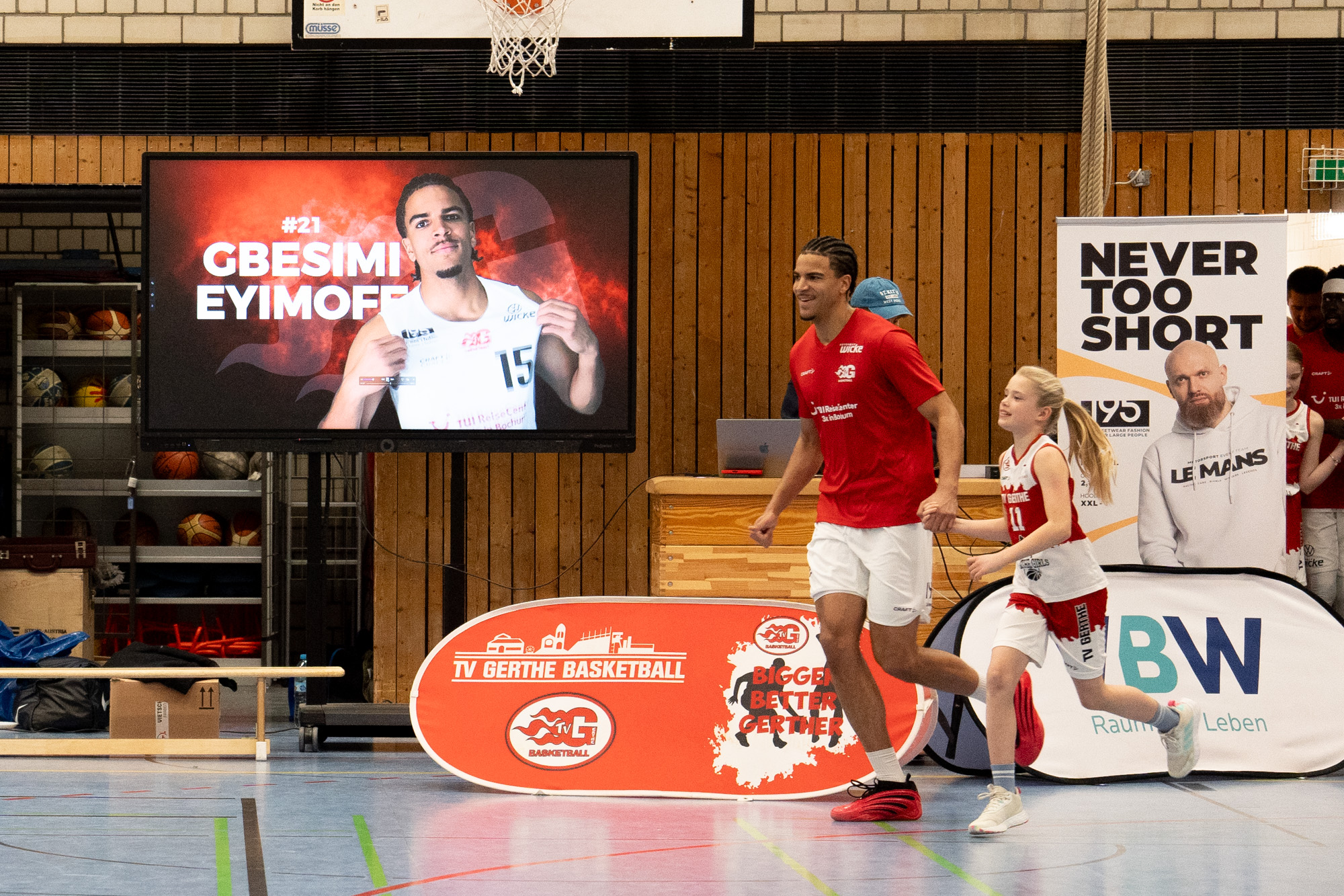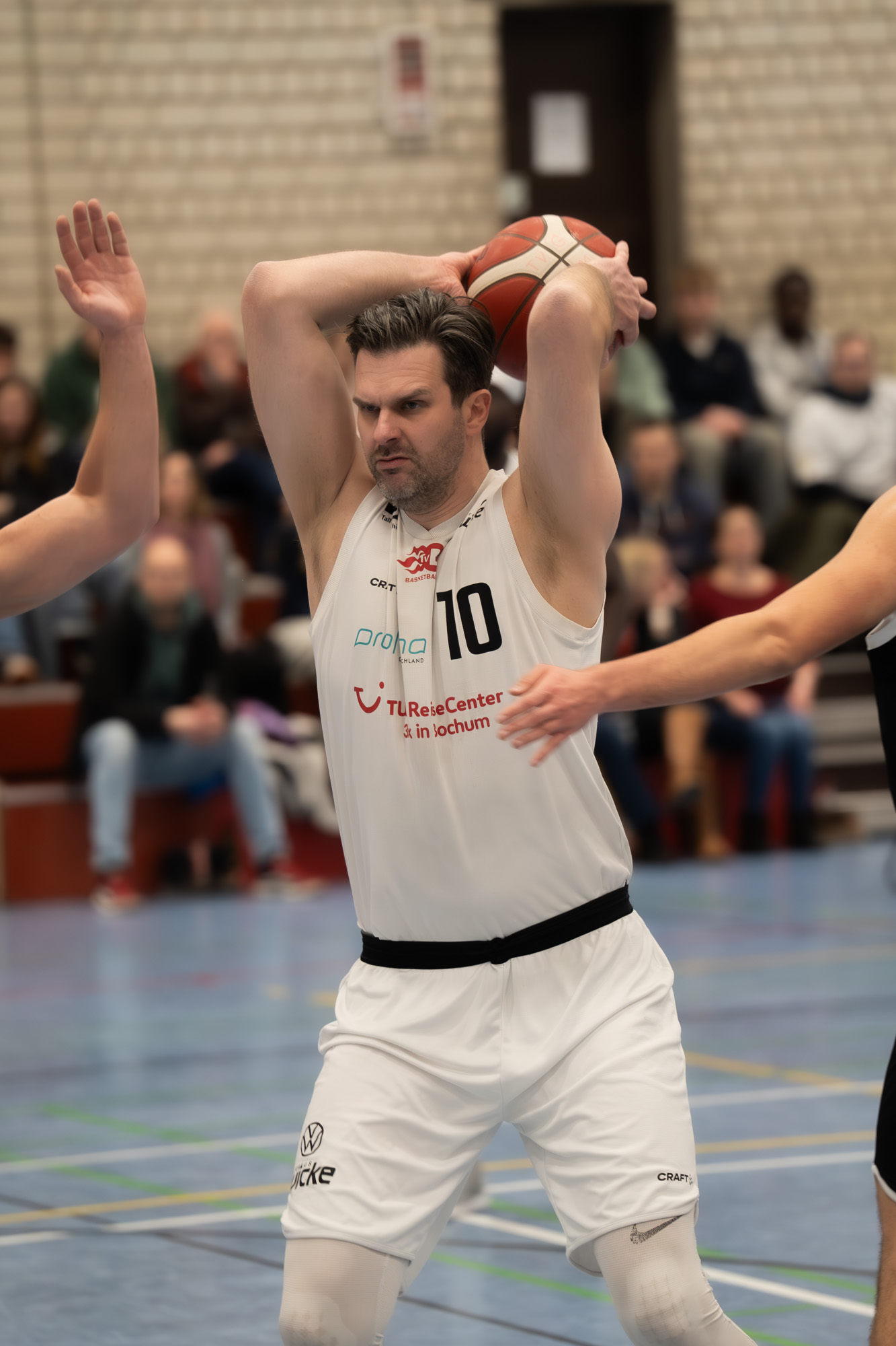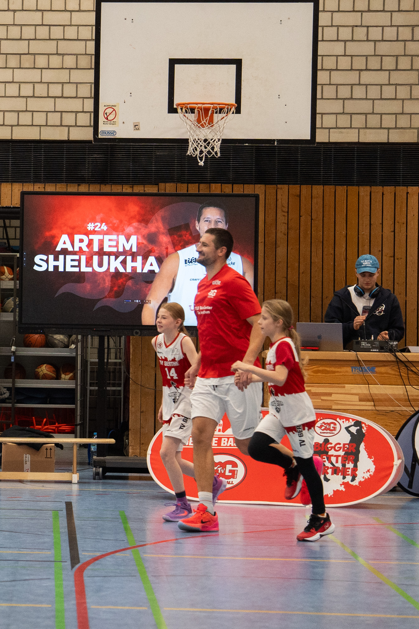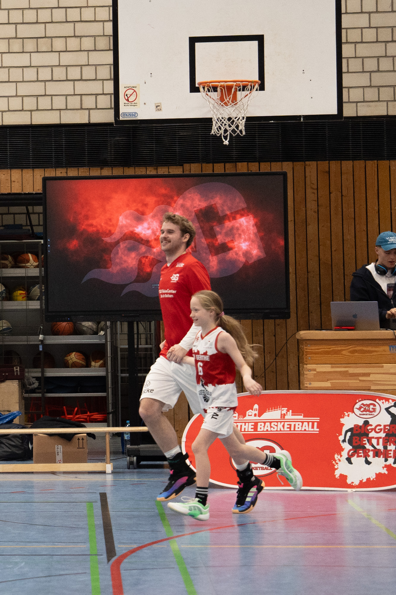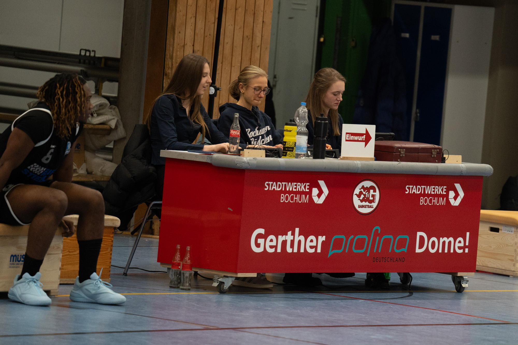 Der Samstagabend im Profina Dome war ein echtes Highlight – sportlich wie auch atmosphärisch. Die Halle war fest in Gerther Hand, rund 250 Zuschauer sorgten für lautstarke Unterstützung, und der Nikolaus selbst schaute vorbei und machte den Abend für die Kinder unvergesslich. Rund 60 Kids durften vom Nikolaus überbrachte Schokolade genießen, dazu stellte die Sportjugend des Stadtsportbundes Bochum die aufblasbare Basketballanlage „4 Gewinnt“, die von den Kindern begeistert genutzt wurde.