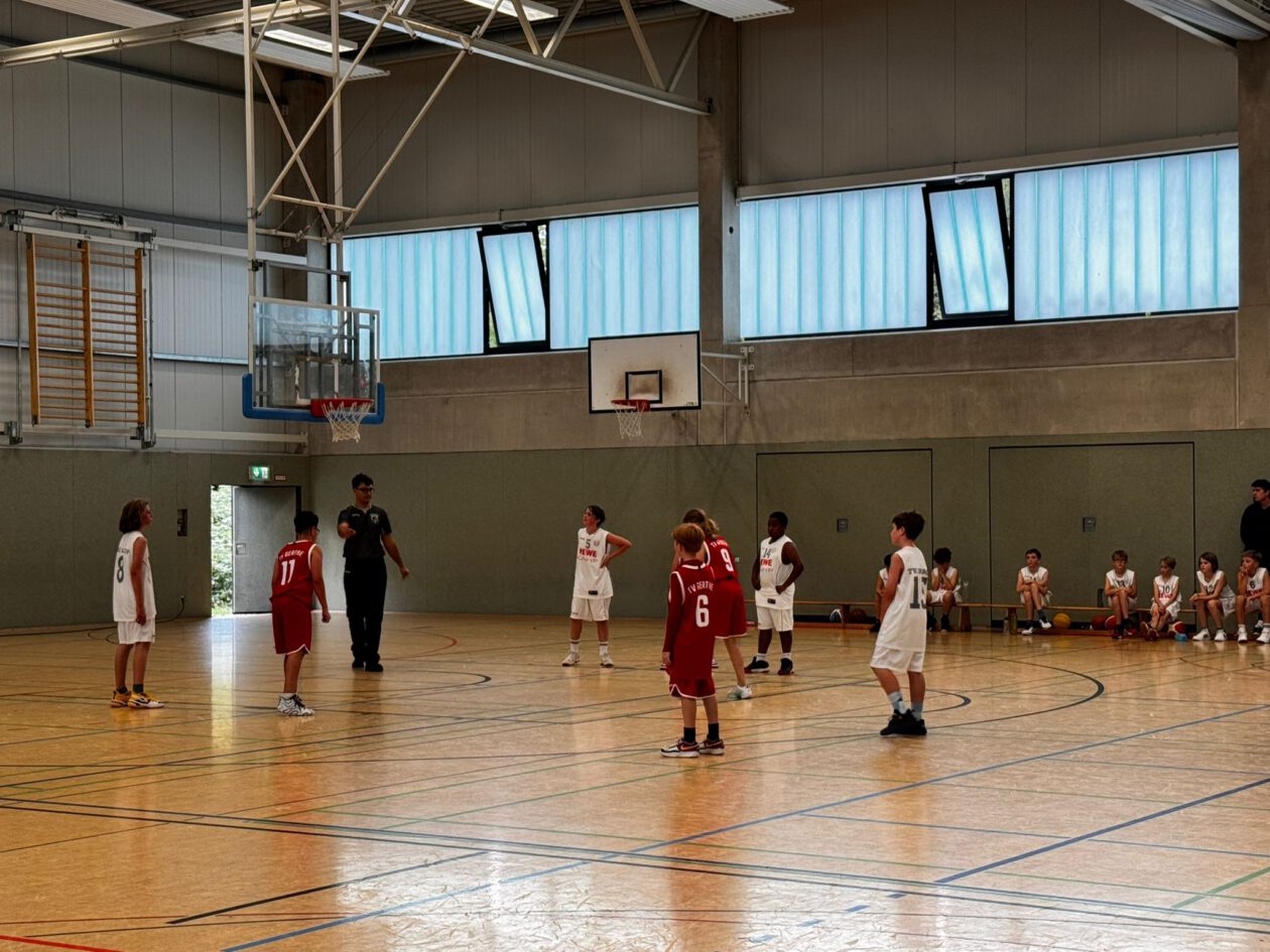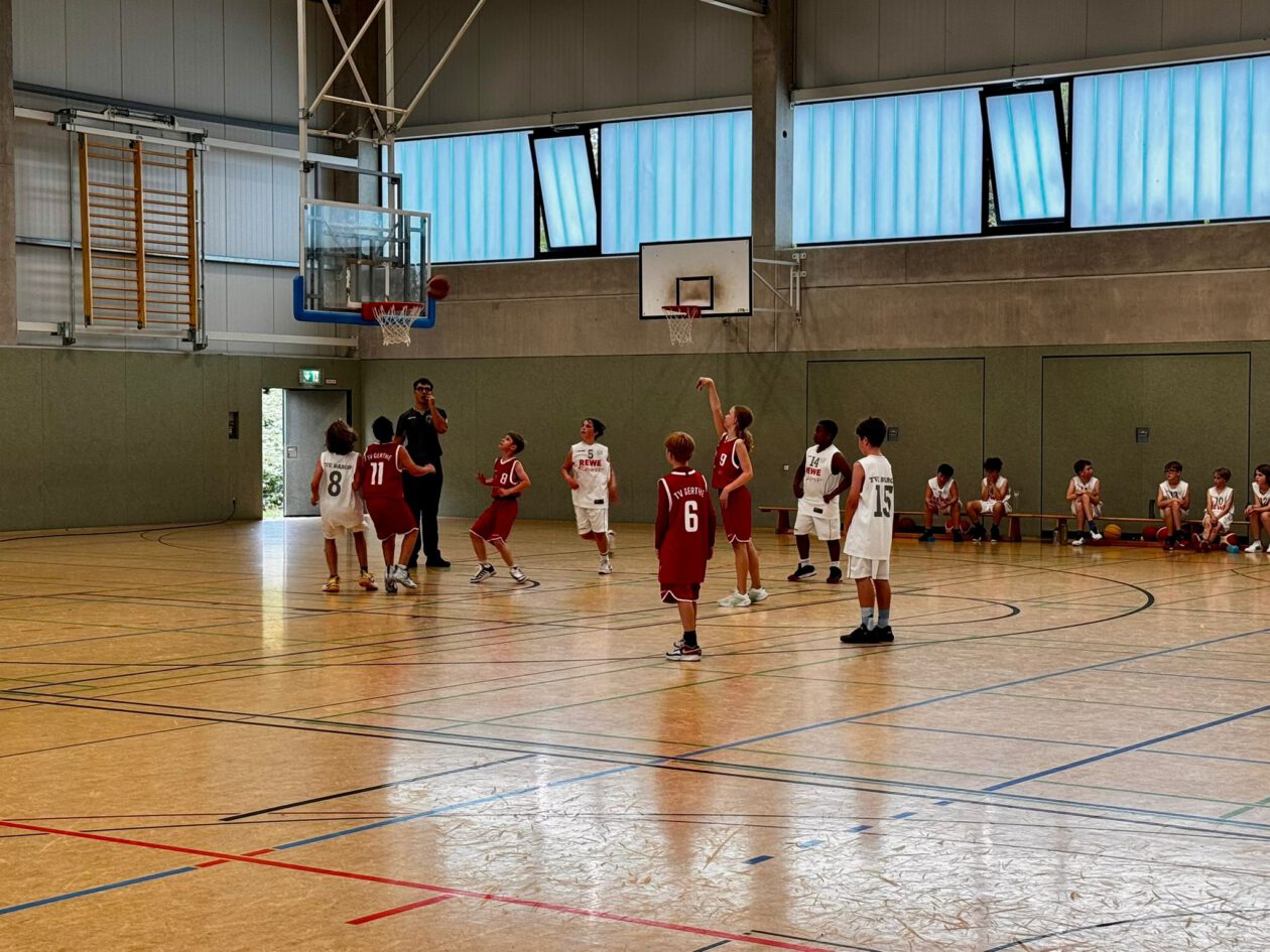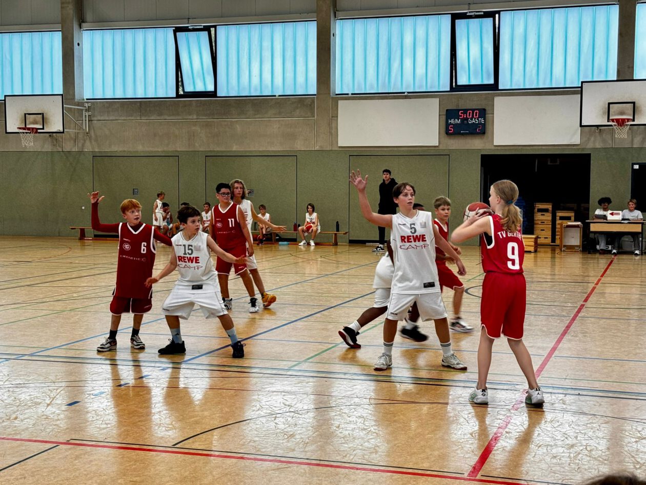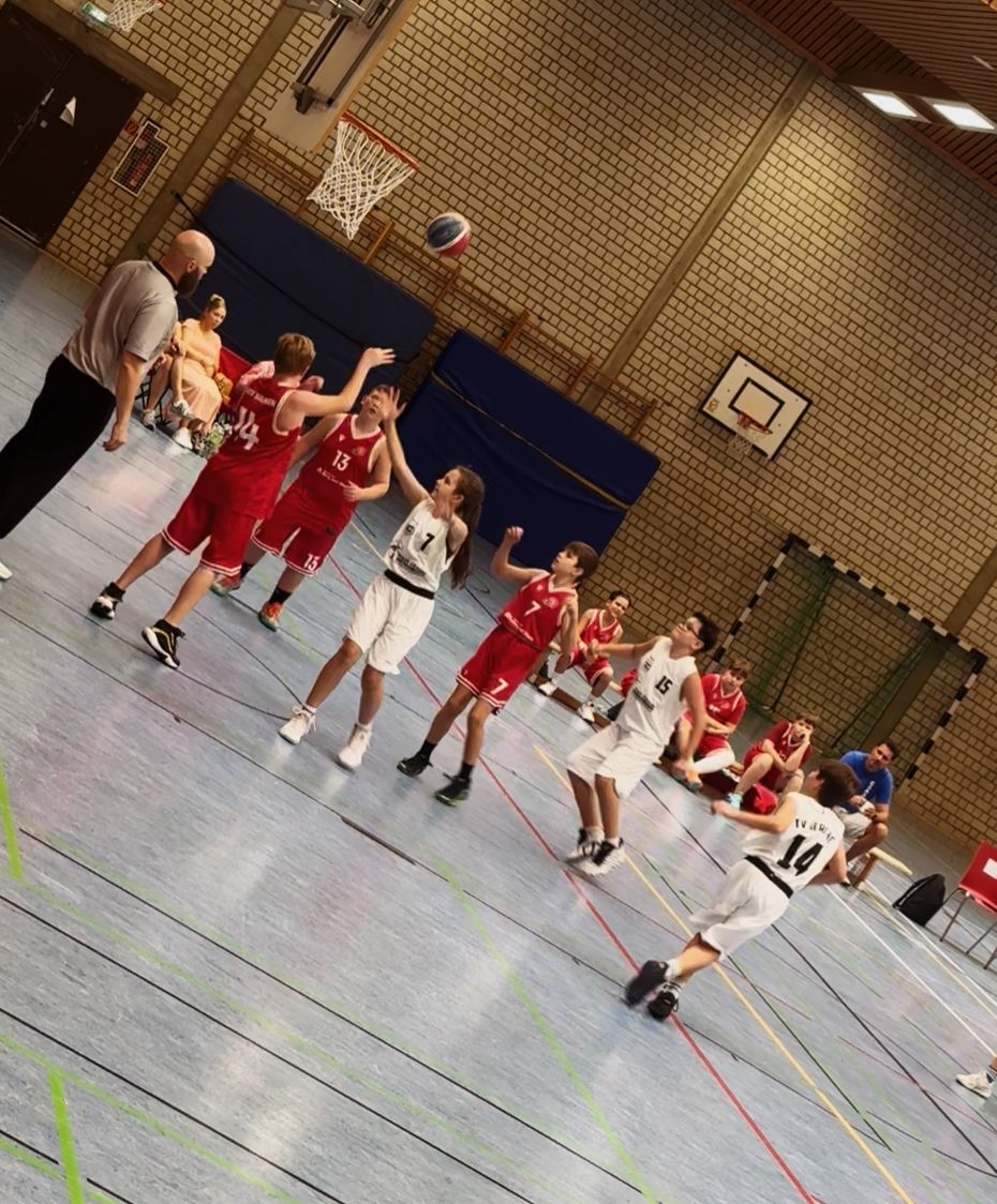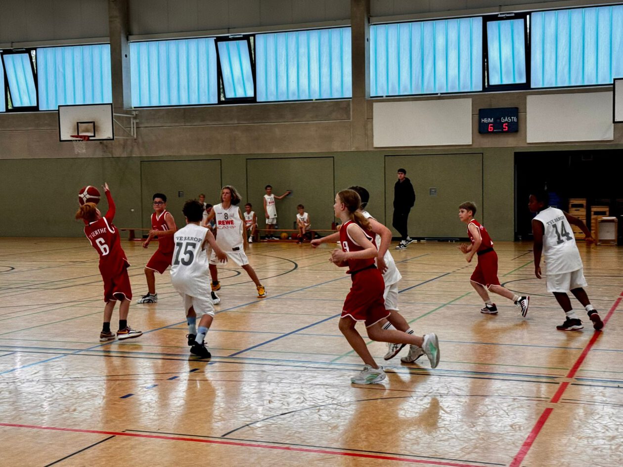 Im nächsten Heimspiel ging es gegen DJK-Adler Frintrop. Die Gäste waren mit nur 7 Spielern angereist, zeigten aber von allen Gegnern bisher die beste Spielstruktur. Die Spieler hatten klare Positionen und suchten die Missmatches. Hier zahlten wir in einigen Situation sehr viel Lehrgeld, weil wir zu oft den Ballgewinn haben wollten, statt bei den Gegenspielern zu bleiben. Das führte zu einfachen Körben für die Gäste. Wir steigerten uns aber im Laufe des Spiels und es gab Achtel, wo wir defensiv nicht viel zuließen und gut die starke Hand zu machten. Offensiv agierten wir mutig, ließen aber leider zu viele Chancen ungenutzt. Ein Sonderlob haben sich in diesem Spiel Damian und Johann verdient, die offensiv gute Entscheidungen trafen und sehenswerte Treffer erzielen konnten. Svea und Theresa konnten auch offensiv glänzen. Weil die Gegner unsere Fehler konsequent bestrafen ging das Spiel mit 54 zu 84 ein bisschen zu deutlich aus. Hier war ein engeres Ergebnis auf jeden Fall möglich gewesen.